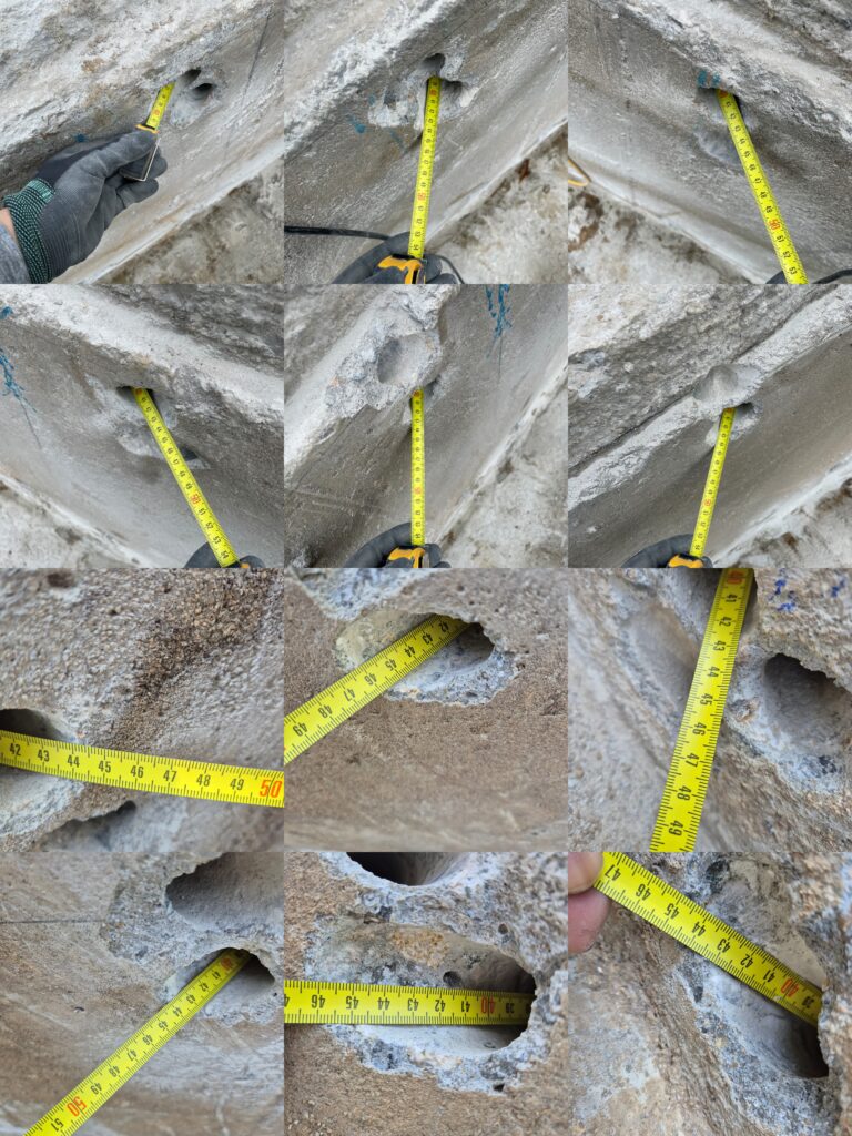 📌 철근 규격: D25 (직경 25mm) 📌 천공 직경: 32mm (철근 직경보다 약 7mm 큰 직경으로 천공) 📌 천공 깊이: 560mm (초기 요청은 1m 이상!) 📌 천공 각도: 45도 각도 유지 필수